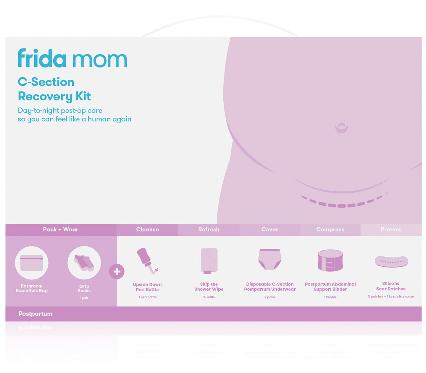 A curated kit designed with C-Section mamas in mind. It includes every day-to-night essential you’ll need for a smooth recovery.